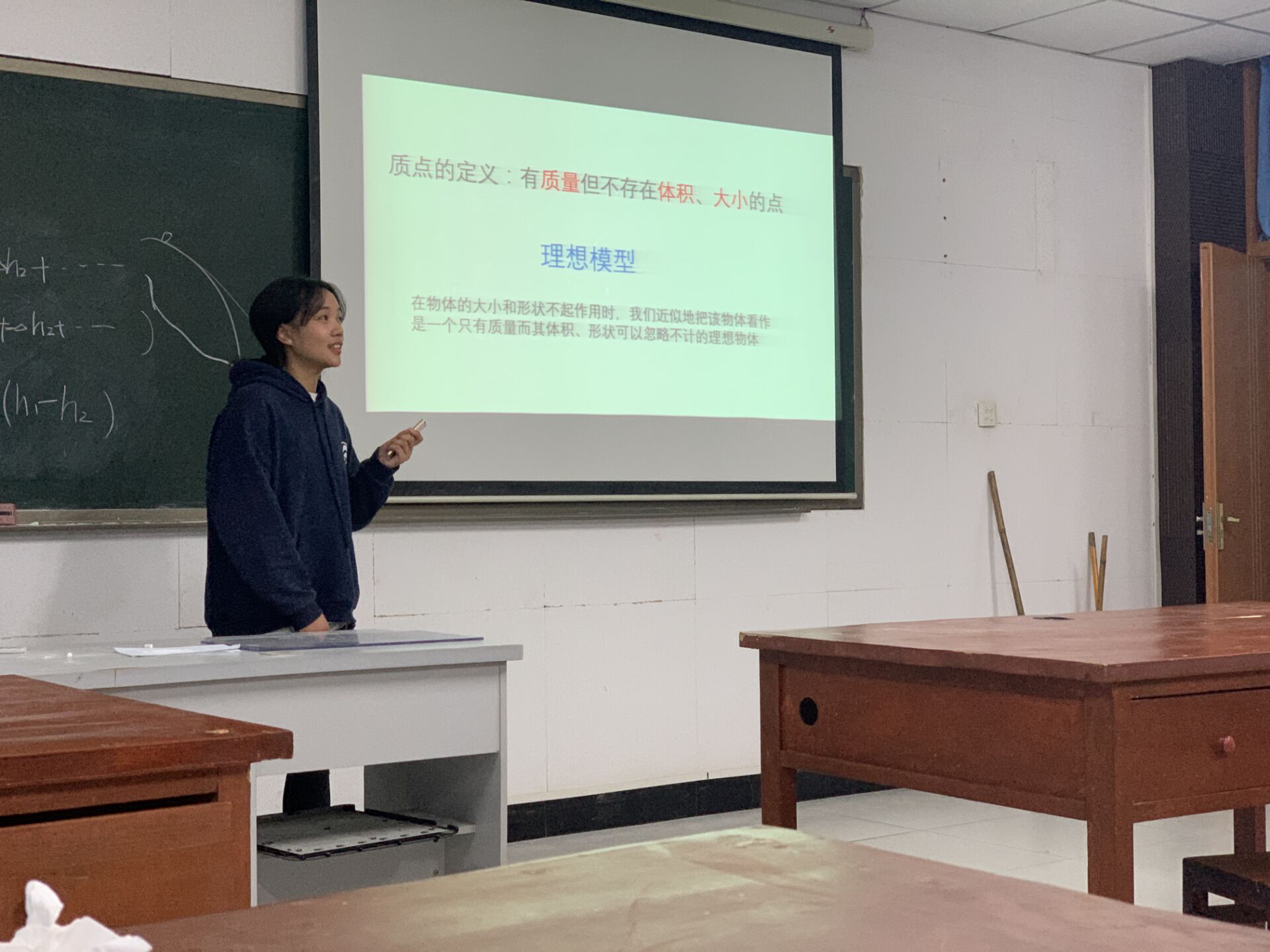 2019年12月12日,刘力溧同学在给我们讲解质点的概念,她先用图片来进入课程然后通过不同的物理现象的来引入质点这一概念,以及在哪些情况下能用质点。刘力溧同学准备的很充分,虽然是才开始试讲,但是已经颇有几分老师的样子了。