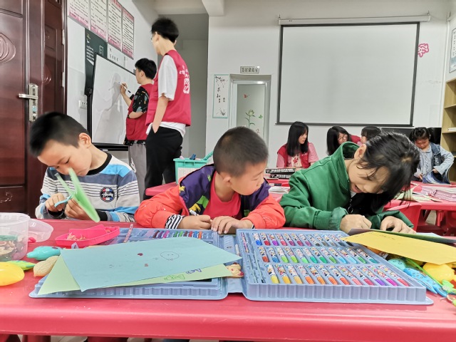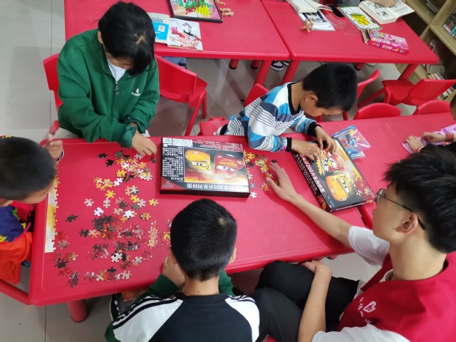 志愿者和小朋友们一起下棋,以楚河汉界之分,利用各种棋种特性,相互商量谋划,双方各显神通,难分伯仲。在下棋过程中,感受中国传统棋类文化的艺术与魅力。与此同时,几个小朋友和志愿者聚在一起,认真地寻找着如何将分散的拼图,拼出完整的图样。渐渐地,散乱的小方块,也有了自己独特的位置,聚集在一起,构造出一幅好看的图案。转眼看去,另一边的志愿者在和小朋友们一起创作画作,有的在白板上画,有的用水彩在纸面上涂鸦,期间其乐融融的玩成一片。那边的志愿者在和小男孩们一起研究,怎么改造纸飞机才能让他们飞得更远,一遍遍修正一遍遍试飞,最终研究出可以飞的很远的纸飞机,这就是实践出真理。