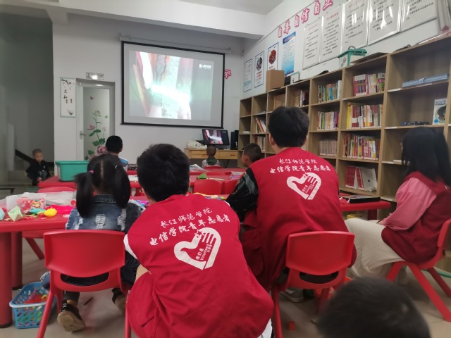 随后大家又聚在一起,播放的动画片吸引了小朋友的注意力,更让志愿者们回忆起自己的童年故事,奥特曼、柯南等统统从沉睡中苏醒,大家畅所欲言,共同分享趣事。度过一段欢乐的时光后,在志愿者的组织下,全体志愿者和小朋友拍照留影。正式结束了本次支教活动。