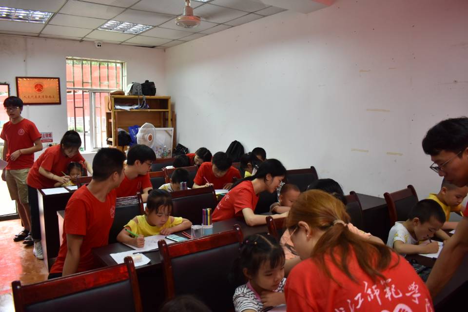 上午8:00志愿者到达目的地,组织小朋友集合完毕后,开始进行一小时的暑期作业辅导。凭借着孩子们对待作业的认真态度和志愿者们在一旁悉心的教导,辅导作业的任务顺利完成!