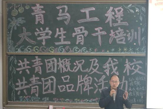 肖俊老师首先以当代大学生骨干应该政治好学习好、思维新、视野广、自律严为开头给我们讲述一位学长的事例。同学们据此学到当代大学生应当如何做。接着肖老师讲到共青团的概况,随后又阐述了我校共青团概况及品牌活动有:三下乡、校园之春、挑战杯、五四表彰、社团文化艺术节、感动长师等,这些活动能让学生有充分的锻炼,提高学生的视野。最后谈到电信学院团学工作:为学生入党推优、党组织生活、基层团建等。