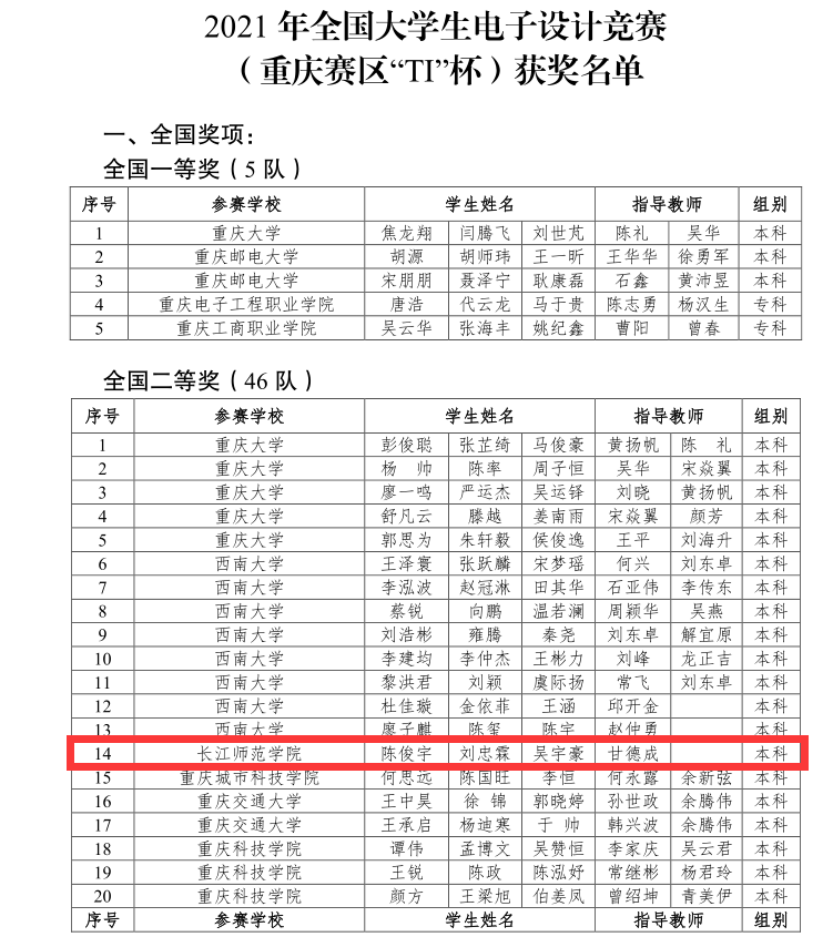 a片无码 学子在2021年全国大学生电子设计竞赛中荣获国家级二等奖a片无码 学子在2021年全国大学生电子设计竞赛中荣获国家级二等奖 2021年全国大学生电子设计竞赛(简称“TI杯”)11月4日开赛至11月7日正式结束。来自全国29个省市赛区的1117所院校,19735个学生队伍,共计近6万名大学生报名参加。 来自全国各个省市赛区的322个队伍荣获全国一等奖(仅占参赛队伍的2.45%),791个队伍将全国二等奖(仅占参赛队伍的4.06%)。 经过四天三夜的艰苦比赛与历经两个月严谨专业的两轮测评考核与结果公示通报,我校有一队获得本科组全国二等奖、有五队获得重庆市本科组一等奖,取得了此项赛事我校有史以来最好成绩,并实现了全国大学生电子设计竞赛国家级奖项零的突破。甘德成老师荣获赛区优秀指导教师,a片无码 荣获优秀组织单位奖。