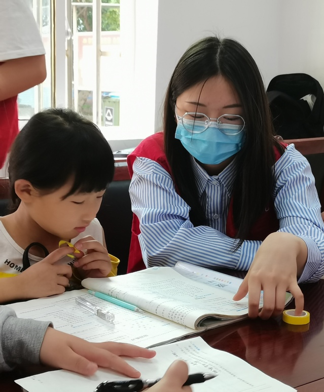 课堂上,“大朋友”、“小朋友”围坐一圈,作为志愿者的“大朋友”拿着精心准备好的备课本在向小朋友们讲解着难题,认真的样子就是一位老师,而孩子们坐在下面认真且好奇地听着老师讲的每一句话,同时也有一些调皮的孩子让志愿者们哭笑不得,例如有的小朋友在上课吵闹,整个课堂比菜市场还热闹,却不妨碍知识在一大一小的身影间传播,又如一小女孩“人小鬼大”,吵着要吃东西,志愿者本着志愿细则,无法给予食物,又不忍正在长身体的孩子挨饿,耐心带着她回家吃饭,地点却是在小卖部…….