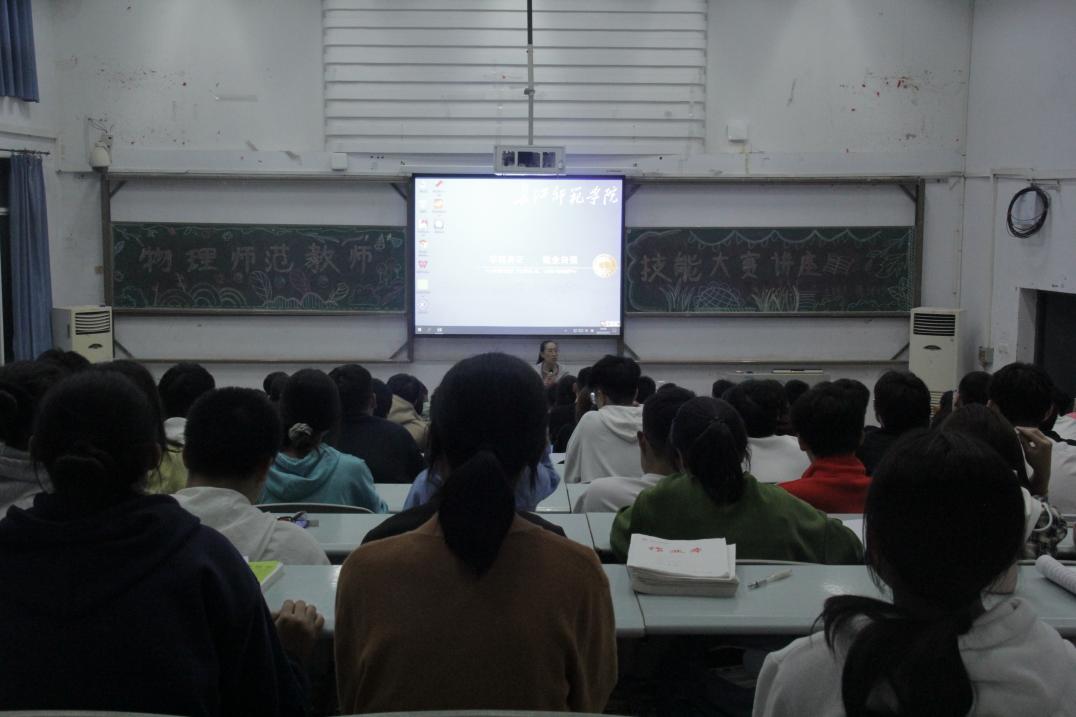 物理创新与技能团队葛泽玲老师向大家介绍了格致杯全国物理教学技能大赛、川渝杯师范生技能大赛、田家炳杯全国大学生教学技能竞赛等各类比赛,也对学院往届学生参与竞赛获奖情况作了宣传。葛老师强调大家应该将学科竞赛纳入自己的大学规划中,及早进行信息收集,了解各项学科竞赛,培养兴趣爱好,锁定重点目标,及时与老师沟通,师生协作,积极参与。