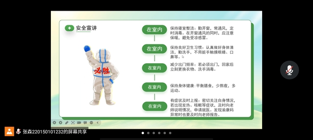 会议伊始,主持人进行点名。紧接着,同学们齐唱班歌。随后,各班开始主题讨论。同学们踊跃发言道:“作为新一代青年,要强化主体意识,明确责任担当,自觉弘扬伟大抗疫精神,坚定战胜疫情信心,在躬身入局、知行合一中践行‘强国有我’的铮铮誓言。”而后,进行安全宣讲。主持人谈到同学们在室外、室内、网络等场合要遵从疫情防控要求,积极推动疫情防控的开展。最后,各班委进行事务传达,并提醒同学们要加强体育锻炼,提高身体素质。