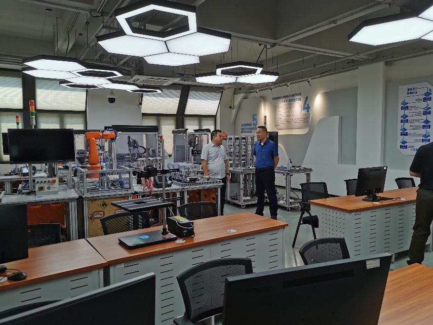 中国(重庆)职业技能公共实训中心是人社部批准建设的国家级公共实训基地,主要功能集“公共实训、技能评价、技能竞赛、技能研修、就业指导、劳动教育、职业体验”七位一体。此行重点调研了信息通信技术、智能制造、轨道交通等实训中心,针对实训软硬件条件建设、人才培养、校企合作等进行了深入探讨。