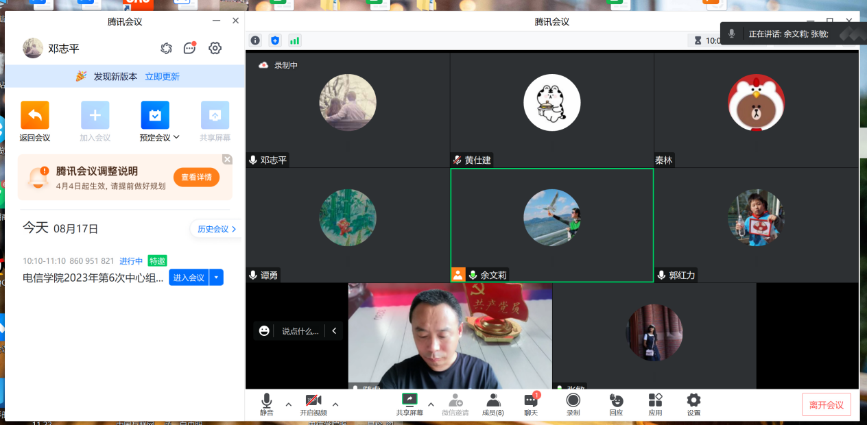 电信学院党委召开理论学习中心组第六次学习会2023年8月17日上午10点,电信学院党委在腾讯会议开展了理论学习中心组第六次学习会。会议由学院党委书记张敏主持,全体党委委员参加了本次会议,非处级干部列席。会上张敏书记组织学习了《习近平在内蒙古考察时的重要讲话精神》、习近平在二十届中共中央政治局第六次集体学习时的重要讲话精神、习近平总书记重要文章《健全全面从严治党体系推动新时代党的建设新的伟大工程向纵深发展》。 全体党委委员纷纷发表意见,其中,党随虎同志汇报了暑假期间申硕工程假期攻坚打造材料情况和智能感知技术重点实验室设备安装及运行情况,学院大门改造进程,并通报学科竞赛取得新的进步;张敏同志汇报了暑期学风建设情况,全院正大力开展素质拓展教育,并呼吁全院勠力同心做好19级的就业工作,上好毕业生这最后一堂课。郭红力院长汇报了23版人才培养方案的梳理情况和22级电子信息类专业分流情况。 此次学习是在全院上下开展学习贯彻习近平新时代中国特色社会主义思想主题教育的背景下,落实“以学促干”,狠抓实效的有力举措。学院党委将不断深化对自我革命规律的认识,不断推进学院党建工作的理论创新、实践创新、制度创新,立足新的形势任务,健全各负其责、统一协调的管党治党责任格局,把全的要求、严的基调、治的理念落实到全面从严治党体系的构建之中。