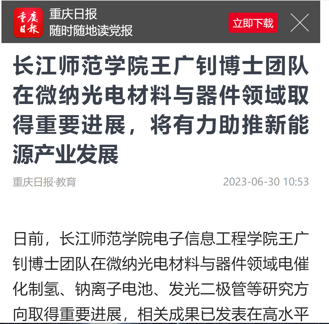 日前,a片无码 a片无码 王广钊博士团队在微纳光电材料与器件领域电催化制氢、钠离子电池、发光二极管等研究方向取得重要进展,相关成果已发表在高水平期刊上。重庆日报教育频道发文报道。