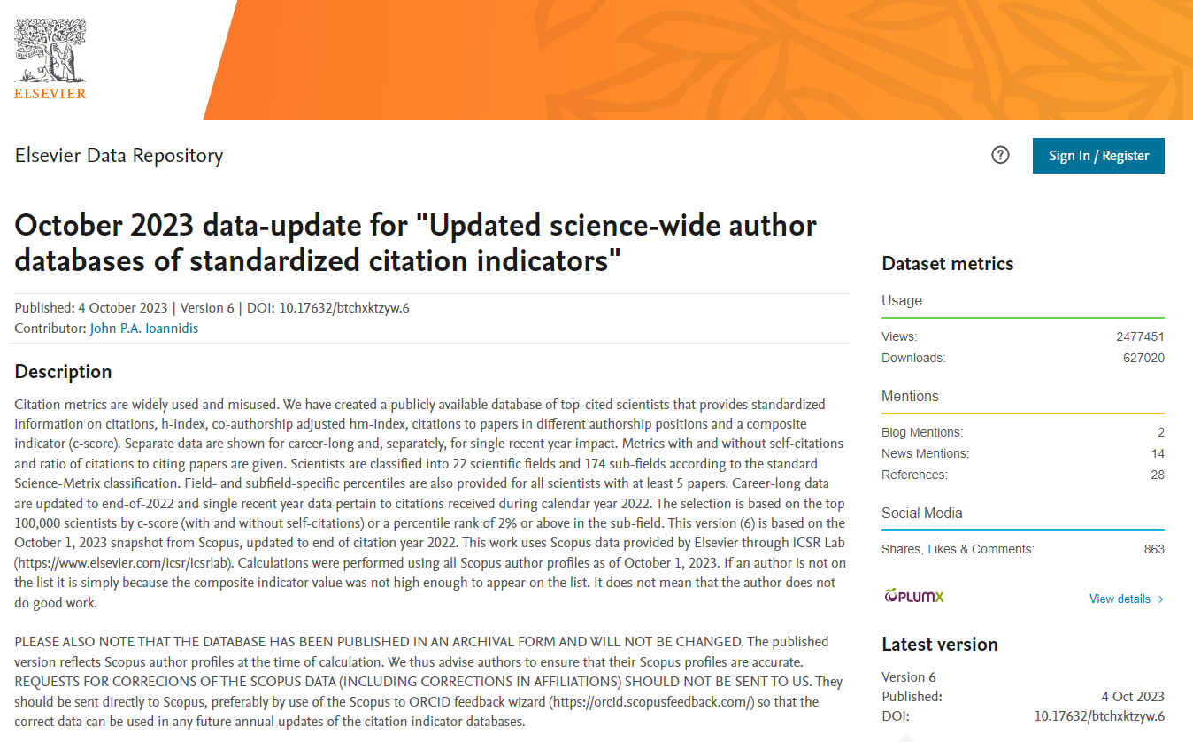 全球前2%顶尖科学家榜单是Elsevier与斯坦福大学John P. A. Ioannidis教授团队合作的项目成果,发布在Elsevier旗下的Mendeley Data网站上。榜单基于Scopus数据库的引用数据系统分析,以被引数(区分自引和他引,提供自引数据)、H指数、HM因子等6种综合指标 (composite score,C-score),根据 “生涯影响力”和“年度影响力”从近700万名科学家中遴选出世界排名前2%的科学家,分为22个领域和176个细分子领域;为科学家长期科研表现提供了一个衡量指标,能够更客观、更真实地反映科学家的影响力。 数据来源链接: //elsevier.digitalcommonsdata.com/datasets/btchxktzyw/6 查询链接: //jokergoooo.shinyapps.io/top2pct_scientists/ |