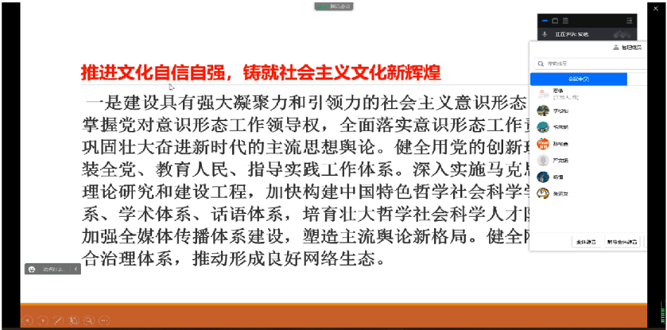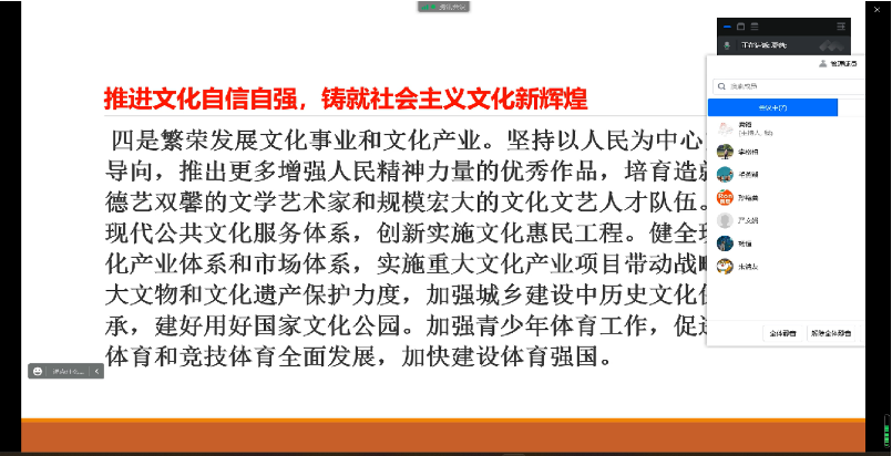 2023年1月13日,电子信息系党支部通过腾讯会议开展了二十大的“推进文化自信自强,铸就社会主义文化新辉煌”党课学习。