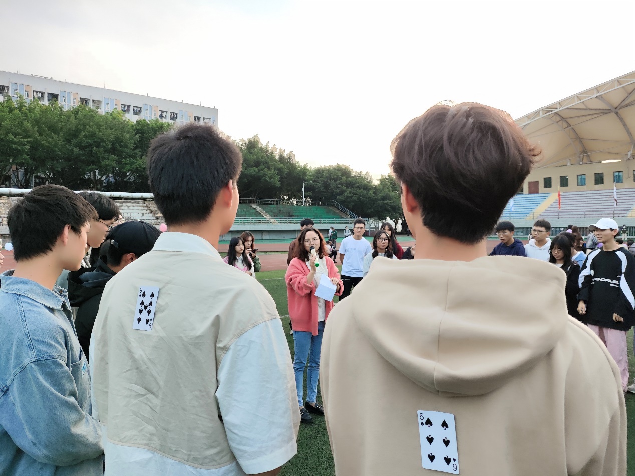 接下来,辅导员带领同学们进行一系列有趣的游戏。比如:纸牌重组。将扑克牌贴在身后,同学们需要在不能言语交流的条件下进行排序,对于排列错误的同学也会进行惩罚抽签。这个游戏让学生学会如何去完成团体任务,并提高大家的团队协作能力,也对同学们之间的默契有所提升。