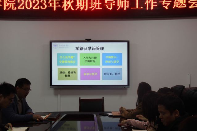 会议第一项,由罗月老师反馈班导师助理工作会情况,罗老师向大家反馈了班导师助理工作会上同学们对每位班导师的意见和建议,同学们对班导师的辛勤付出表示感谢,同时也期待班导师在职业生涯规划、学科竞赛等方面给予更多指导。 会议第二项,各年级辅导员汇报班级情况,辅导员们分别从班级整体情况和重点关注两个方面进行汇报,2023级辅导员希望班导师能重点关注新生的入学适应性问题,发现学生有问题或困难时,及时与学生沟通。2022级和2021级辅导员希望班导师能重点关注学生的学业和就业问题,加强对学生的学业和职业规划指导,从学科专业角度给予学生更多帮助,共同助推班级建设。 会议第三项,班导师代表开展经验分享。 王广钊老师从自身经历出发,分享了自己通过组建科研团队、走访宿舍、邀请优秀毕业生讲座等方式开展班导师工作,同时他也表示作为班导师要走进学生,深入参与到学生的生活中去。 杜德荣老师从以情感人、以德服人、以礼教人三个方面做了经验分享。他表示班导师要心里时刻装着学生,要拉近师生的情感距离,建立良好的师生关系是培养学生的基础。他还强调,班导师要以身作则,做到想学生所想,急学生所急,办学生之盼,努力成为学生做人的好榜样、学习的好导师、生活的好帮手。 朱斌老师则从学生干部培养方面进行分享,他谈到作为班导师要学会抓关键少数群体,要充分调动班干部的积极性,协助管理好班级,同时他也强调要学会抓住关键节点开展工作,毕业季重点开展就业帮扶,迎新季引导新生做好大学规划等。 会议第四项,副院长郭红力解读学籍管理相关规定。为了让班导师更好了解学生的毕业条件,郭院长详细介绍了学籍管理规定、人才培养方案、毕业条件与学位授予等方面的内容,他还强调班导师要重点关注学业困难生群体,指导困难生做好学业规划,帮助学生提高学习成绩、顺利完成学业。