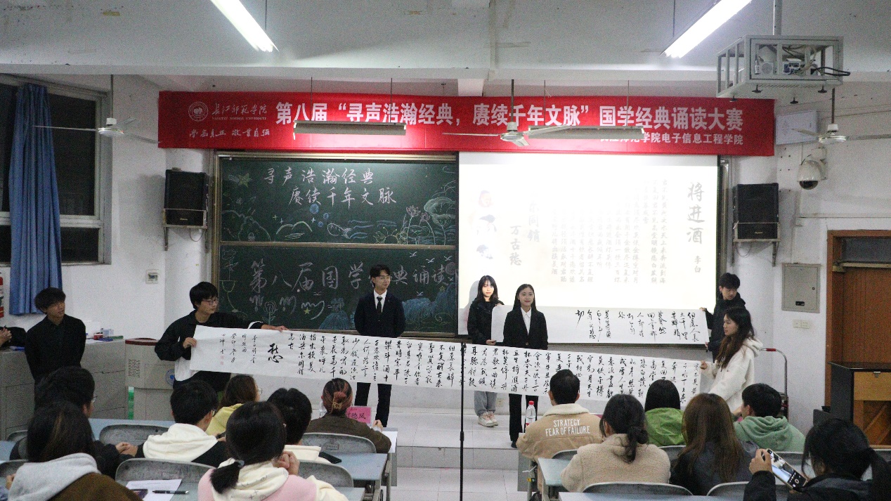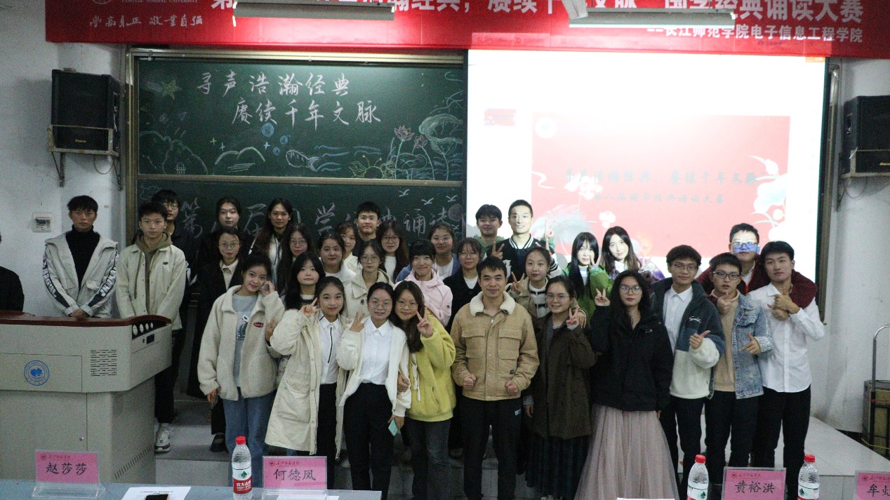 第八届国学经典诵读大会。23级辅导员黄裕洪、执行主席何德凤、主席团成员赵莎莎、张俊毅担任本场比赛的评委。