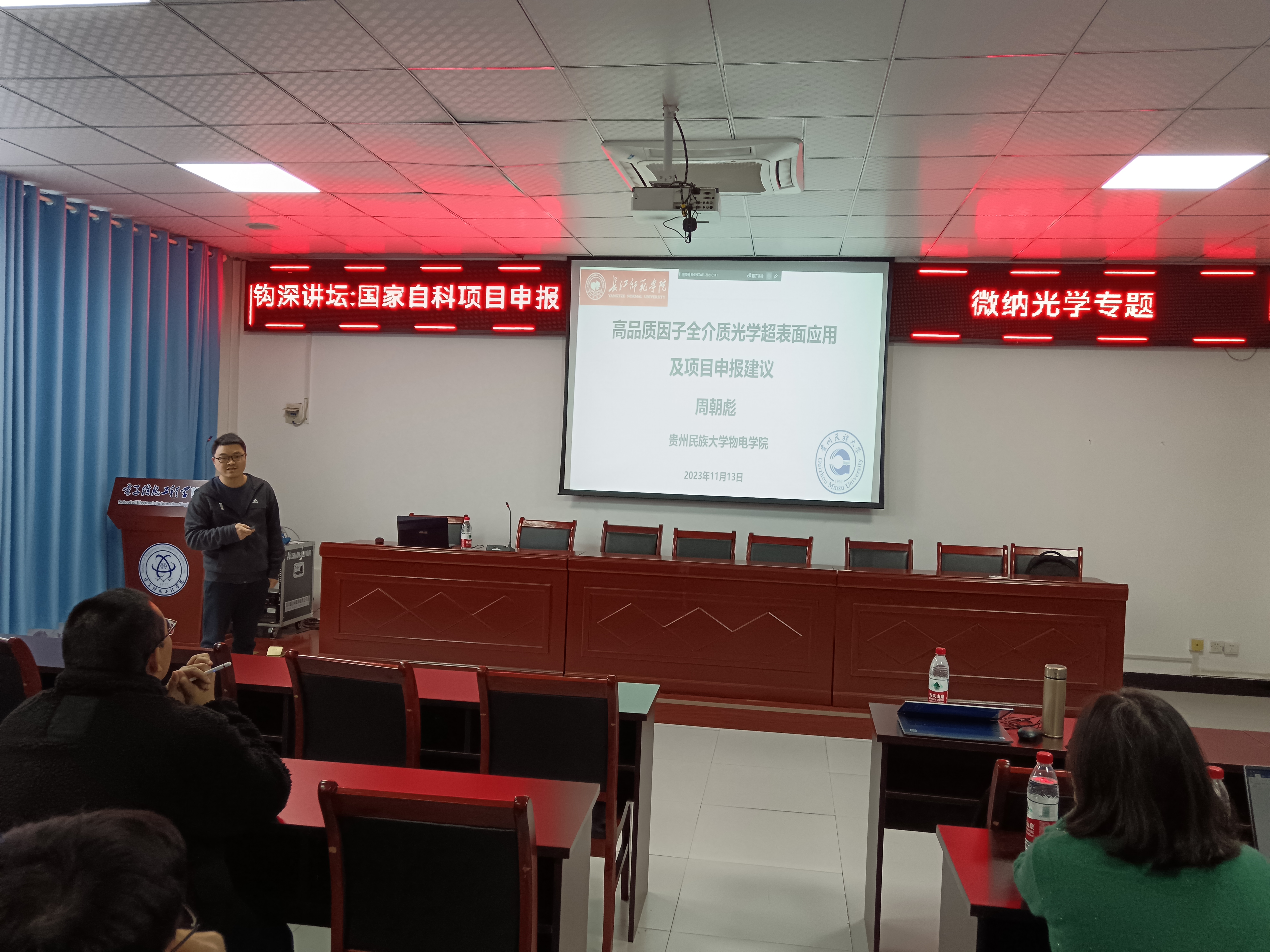 电信学院召开微纳光学专题国家自科项目申报培训会 为做好2024年度国家自然科学基金项目申报工作,不断提高项目申报质量,11月13日上午9:00,贵州民族大学周朝彪副教授受学院邀请在格物楼1508做《高品质因子全介质光学超表面应用及项目申报建议》专题培训会。会议由学院副院长郭红力主持,拟申报2024年国自科基金的相关教师、联培研究生和相关专业本科生参加了培训。