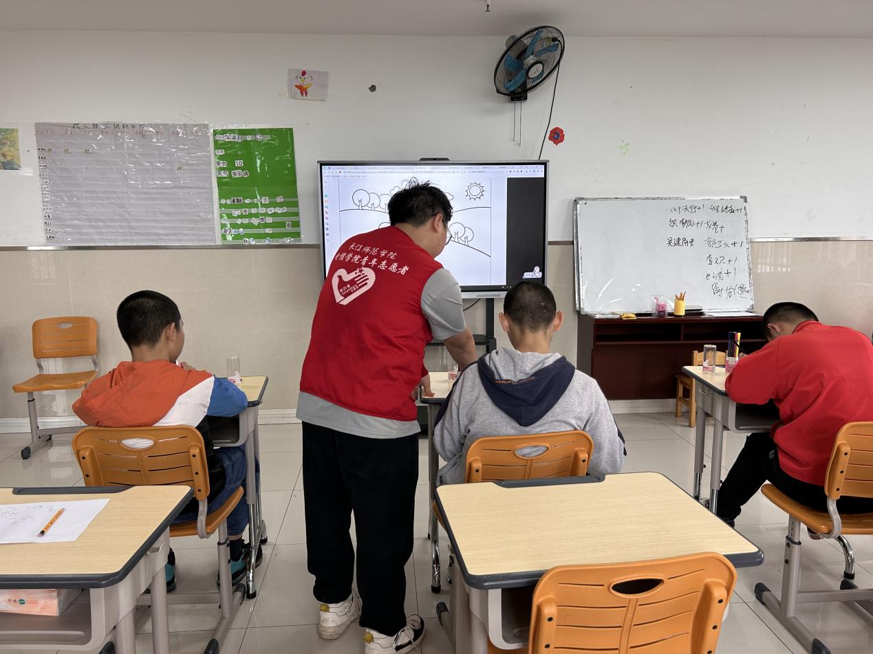 活动开始前,活动负责人在线上发布注意事项,志愿者仔细阅读。活动前期,志愿者7点50准时在学校东门集合,清点人数后前往目的地。到达目的地后,首先将志愿者分为两组,一组志愿者负责幼儿区,另一组志愿者负责成人区。分组完成后,由工作人员带领志愿者前往各自负责区域,再由各班老师安排具体实施工作。在老师的指导下,志愿者首先与学生接触玩耍,一部分志愿者和学生一起玩投筐小游戏,另一部分志愿者与学生一起玩传递篮球小游戏。在游戏中志愿者与学生逐渐熟悉起来。一段时间后,老师组织学生排队,并分配任务,四个志愿者指导学生独立洗衣服,并检查衣物是否清洗干净。剩下的志愿者带领学生去教室写字画画。两部分学生在志愿者指导下完成任务后,统一到一楼食堂处。到达食堂后,老师安排学生坐下,并由厨师示范切菜,示范完毕后,学生按顺序上前切菜,志愿者站在两边观看并指导学生切菜,鼓励学生。之后,志愿者带领学生回到教室练习写字,志愿者在一旁一对一耐心指导学生阅读并写下生词,并多鼓励学生,赞美学生。学生学习疲倦时给学生听音乐放松。写字结束后老师带领志愿者及学生到乒乓球室进行运动。志愿者和学生一起打乒乓球。最后,老师带领学生去食堂就餐。志愿服务活动结束,负责人组织志愿者统一返校。
