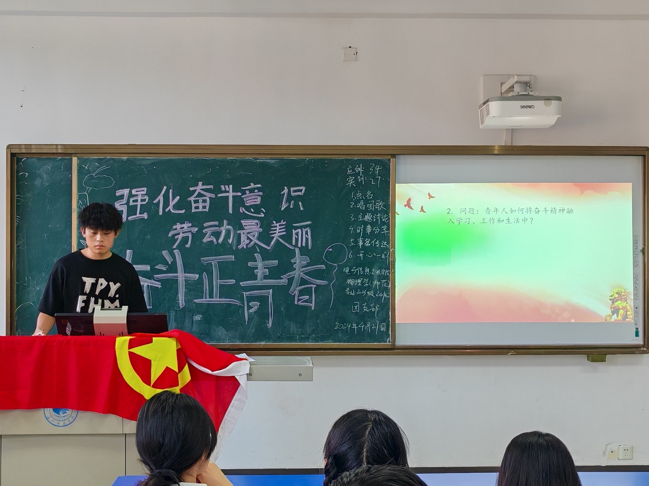 电信学院第十周团会电信学院第十周团会 通讯员:谢思博 电信学院于4月27日16:30在崇礼楼四楼举行以“奋斗正青春—强化奋斗意识,劳动最美丽”为题的团会,旨在强化奋斗意识,弘扬劳动之美。21级、22级、23级全体同学参加。23级辅导员黄裕洪出席。 会议伊始,主持人进行点名,确保全员参与。随后,同学共同齐唱团歌,展现电信学院团结一心、积极向上的精神风貌。