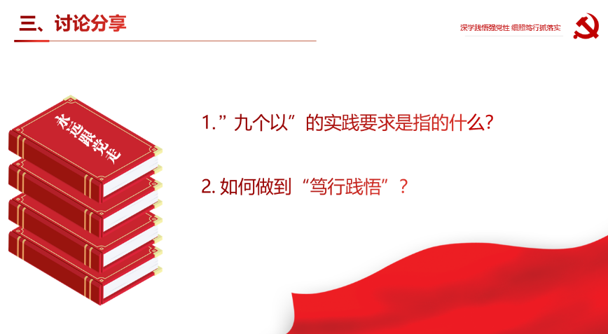 三支部的同志们认为:“九个以”是以坚持党中央集中统一领导为根本保证,以引领伟大社会革命为根本目的,以新时代中国特色社会主义思想为根本遵循,以跳出历史周期率为战略目标,以解决大党独有难题为主攻方向,以健全全面从严治党体系为有效途径,以锻造坚强组织、建设过硬队伍为重要着力点,以正风肃纪反腐为重要抓手,以自我监督和人民监督相结合为强大动力。做到“笃行践悟” 要学习,下得苦功夫,求得真学问,将学习作为终生的习惯;要修德,加强道德修养,注重道德实践;要善于明辨是非,善于决断选择;要劳动,扎扎实实干事,踏踏实实做人。道不可坐论,德不能空谈。