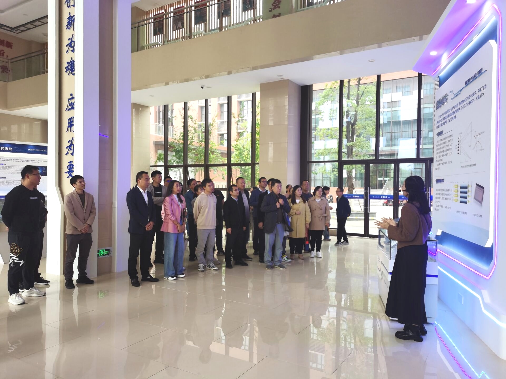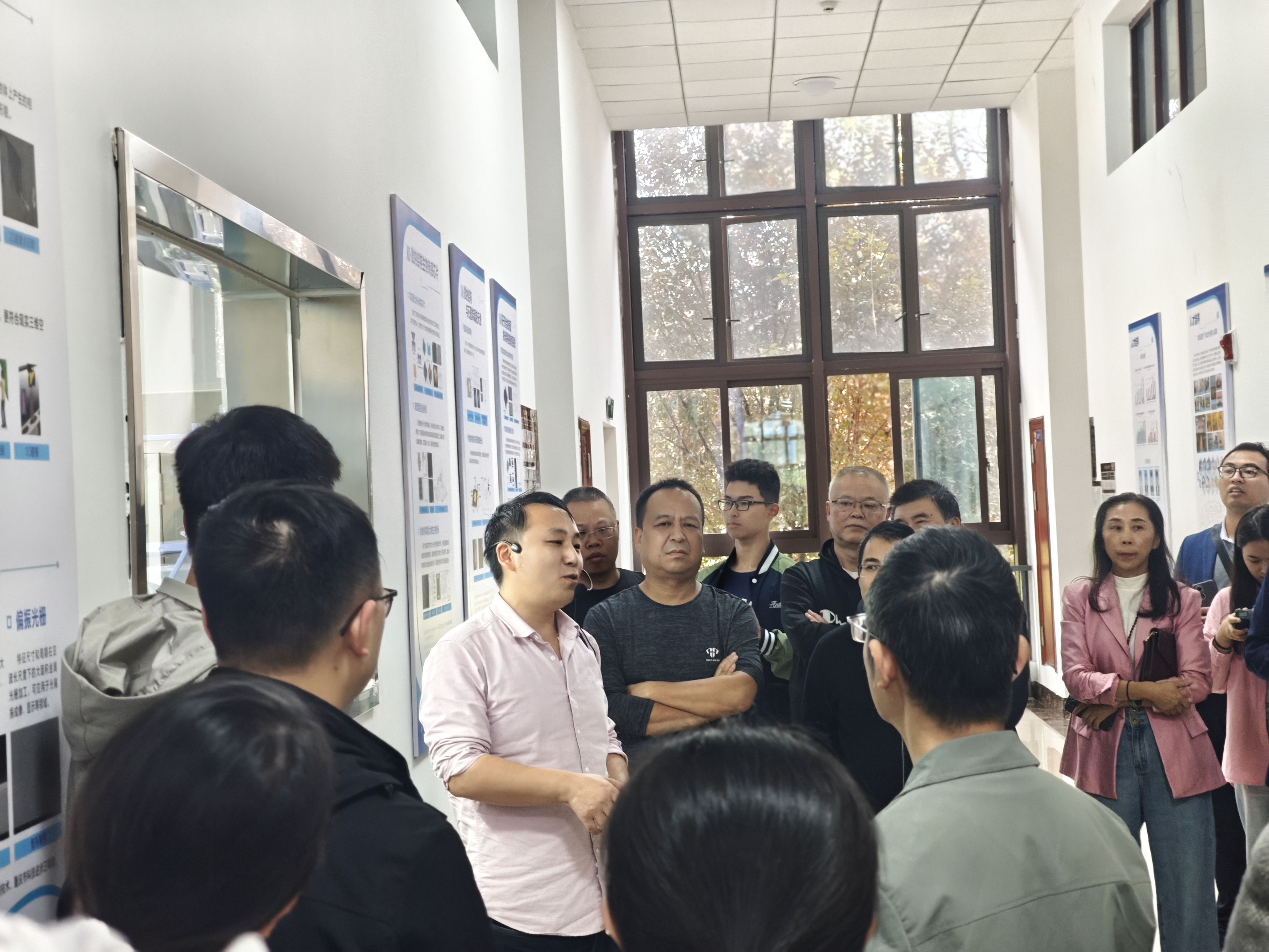 首先,老师们来到至静南楼。易巧钧老师生动讲解了学校科技创新中心的建设与发展。接着,夏良平教授细致讲解了微纳光电器件与智能感知重点实验室目前的总体情况与研究进展。他表示,实验室致力于微纳光芯片相关技术研发,已解决多项技术难题。