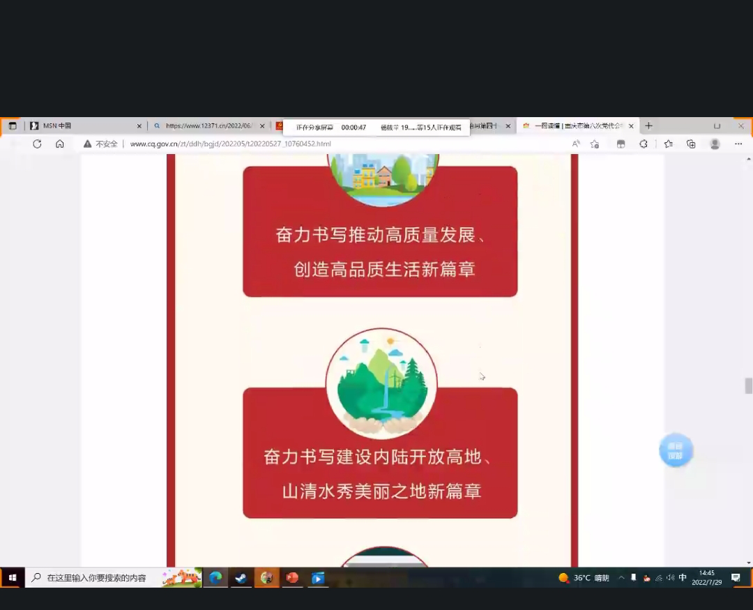 紧接着,由支部书记杨倩带领学生党员们学习习近平总书记在庆祝中国共产党成立100周年大会上的重要讲话精神和学习领会重庆市第六次党代会精神,并播放了关于重庆未来5年地区生产总值的视频,在观看过程中,全体党员同志惊叹于重庆科技的发展、交通工具的便捷、新型环境的改善。随后,通过“习近平总书记在十九届中共中央政治局第四十次集体学习时的重要讲话精神”,党员进一步深入学习领会习近平总书记在庆祝中国共产党成立100周年大会上的重要讲话精神,学习领会重庆市第六次党代会精神。 |