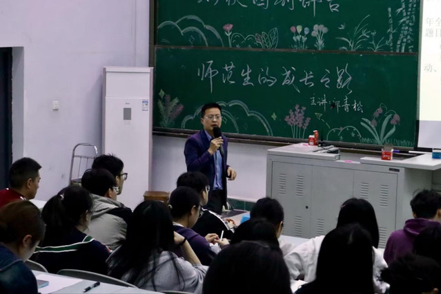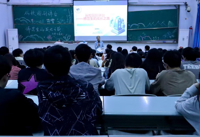 随后,邱青松围绕大学生考编上岸、职业发展等多方面内容进行分享。他强调在校期间要充分准备试讲和说课,通过多种方式提升专业能力,深化对物理本质的理解,并优化教学方法。职场方面,他以自己2011年至2025年的“职业跃迁三部曲”为同学们描绘职业发展蓝图,建议同学们积极关注教育热点,强调改变“说教式”教育,结合社会热点让教育更有实效。