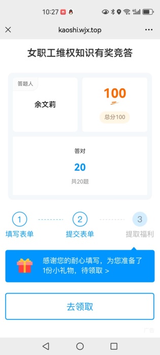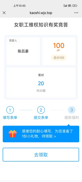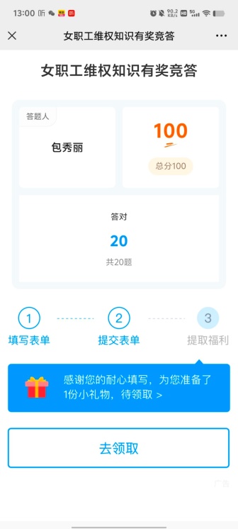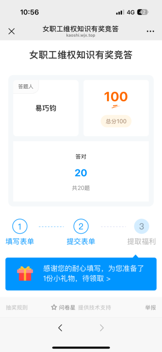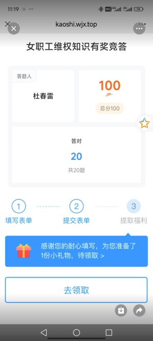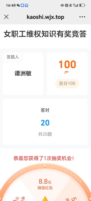 电信学院开展三八节女职工维权知识竞答活动为倡导教职工学法、知法、用法,提高教职工自我保护意识,引导教职工依法维护权益。在2025年三八节来临之际,a片无码 工会开展了女职工维权知识竞答活动。 竞答时间为2025年3月12日-14日,持续两天。竞赛方式是老师们关注“a片无码 工会”微信公众号进行答题。竞赛内容为女职工维权相关知识。竞赛办法是每位女职工答题时,必须准确填写真实姓名、单位(全称)、手机号码。全部题目答完,点击提交结束答题。共20题,每题5分,总分100分。每位老师答题结束后将答题成绩截图发给余文莉。学院32 女职工积极参与答题活动,在规定时间内全部完成了答题,其中有24位老师取得了100分的成绩。 此次竞答活动得到了女职工们的热烈响应和积极参与。通过此次竞答活动,让老师们更进一步全面了解了女职工维权相关知识。今后学院将继续加强相关知识的宣传和学习,确保女职工的权益得到充分保障。 a片无码 分工会 2025年3月17日 撰稿:余文莉,初审:罗月,复审:肖恒,终审:谢正发