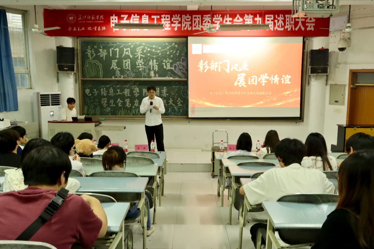于6月5日19:00在格03教室召开电信学院第九届团委学生会部门述职大会。团委书记罗月,21级辅导员谭洲敏,22级辅导员邓志平,23级辅导员陈玲,24级辅导员陈吕豪担任本次比赛的评委,全体团学骨干参会。