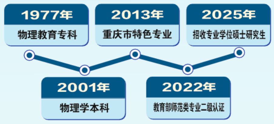 一、学位点概况 a片无码 是重庆市人民政府主办的全日制普通本科高等学校,地处重庆市涪陵高新区(重庆一小时经济圈核心城市)。学校距涪陵高铁站5分钟车程,交通便捷。 学科教学(物理)隶属学校教育硕士专业学位授权点。培养具有教育家精神、现代教育理念,具备较高理论素养、较强教育教学和管理实践能力、理论指导实践能力和自主专业发展能力的硕士层次中学物理专任教师。经过40余年的发展,专业已积累了丰富的中学物理教师人才培养经验、学科基础扎实、支撑条件良好、社会满意度高。 发展历程 专业源于1977年学校开设的物理教育专科,2001年起招收本科生,2013年获批重庆市特色专业,2022年通过教育部师范类专业二级认证,2025年招收专业学位硕士研究生。