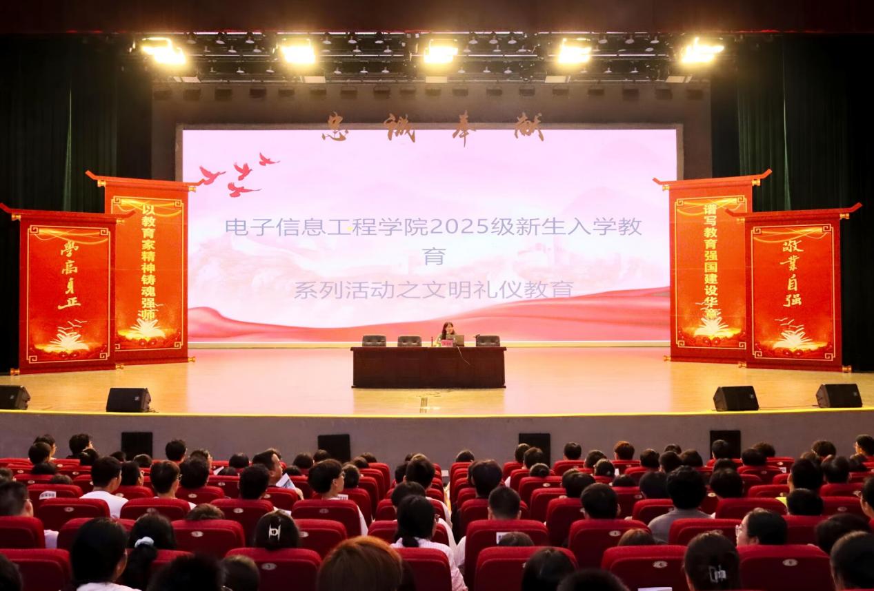 于2025年9月14日10:40在拏云活动中心开展电信学院2025级新生入学教育系列活动之文明礼仪教育讲座,22级辅导员邓志平担任主讲。