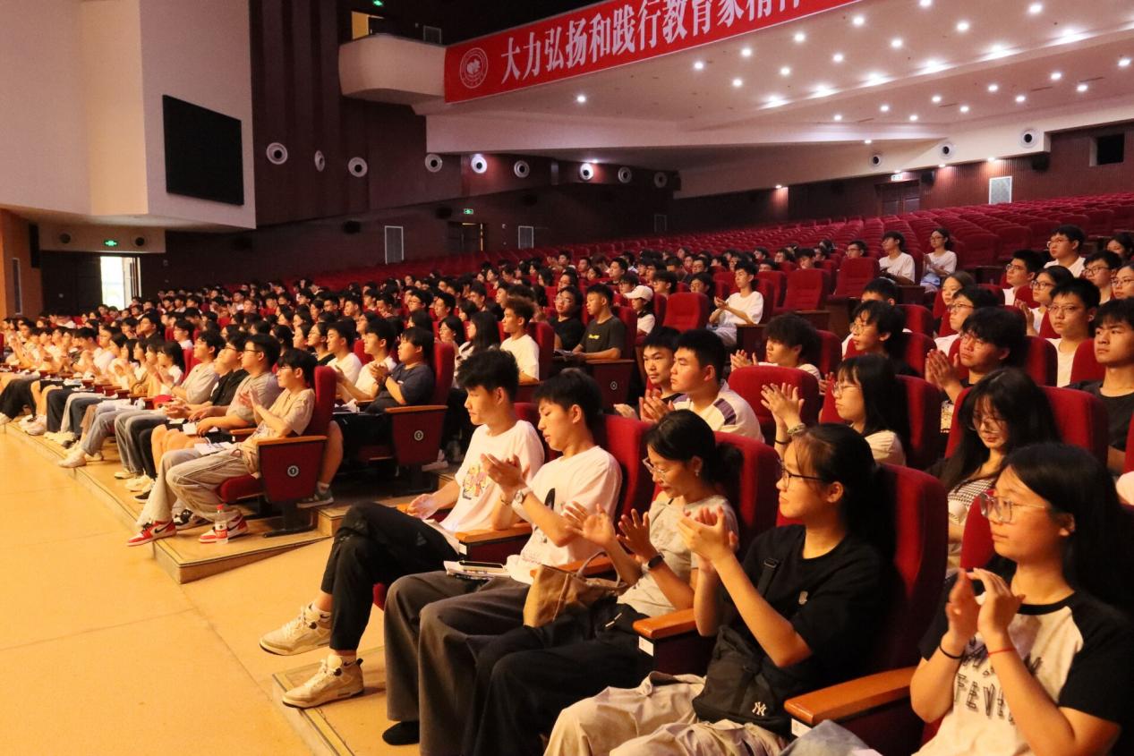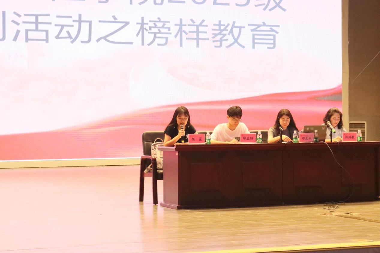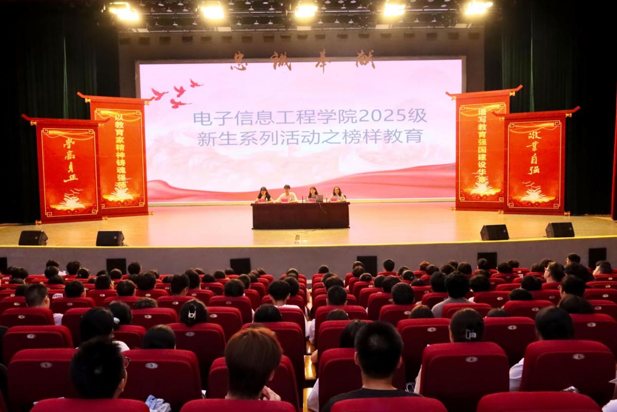 于2025年9月14日10:20在拏云活动中心开展电信学院2025级新生系列活动之榜样教育专题讲座。25级全体新生参会,22级物理学胡星、23级电子信息科学与技术鄢正阳作为优秀学子代表出席本次讲座。讲座由辅导员谭洲敏主持。
