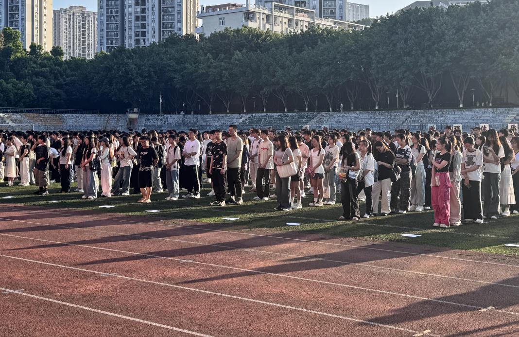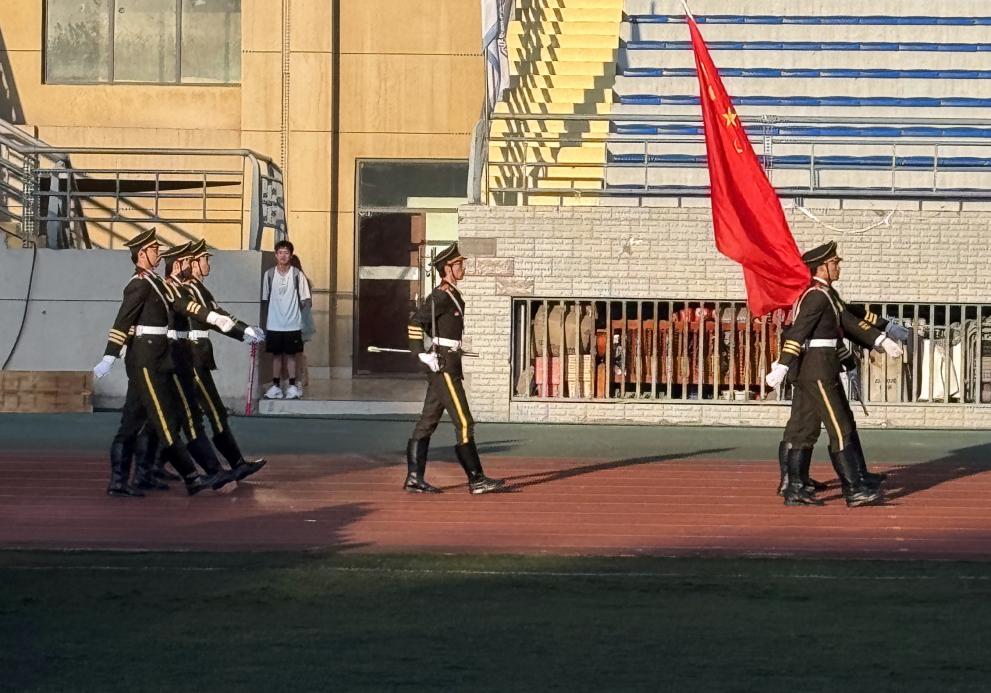 出旗队伍迈着铿锵有力的步伐,护送国旗入场。那整齐划一的节奏,仿佛是青春奋进的有力鼓点。在雄壮激昂的国歌声中,全体师生庄严肃立,行注目礼,目光紧紧追随那缓缓升起的五星红旗。红旗猎猎,迎风飘扬,现场气氛肃穆而激昂,浓厚的爱国情怀与蓬勃的青春气息在空气中激荡交融。