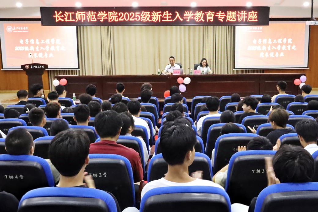 9月13日19:00,电信学院2025级新生入学教育专题讲座“院长说专业”在鉴湖学术报告厅举行。院长党随虎教授主讲,辅导员谭洲敏主持,2025级全体新生到场聆听。