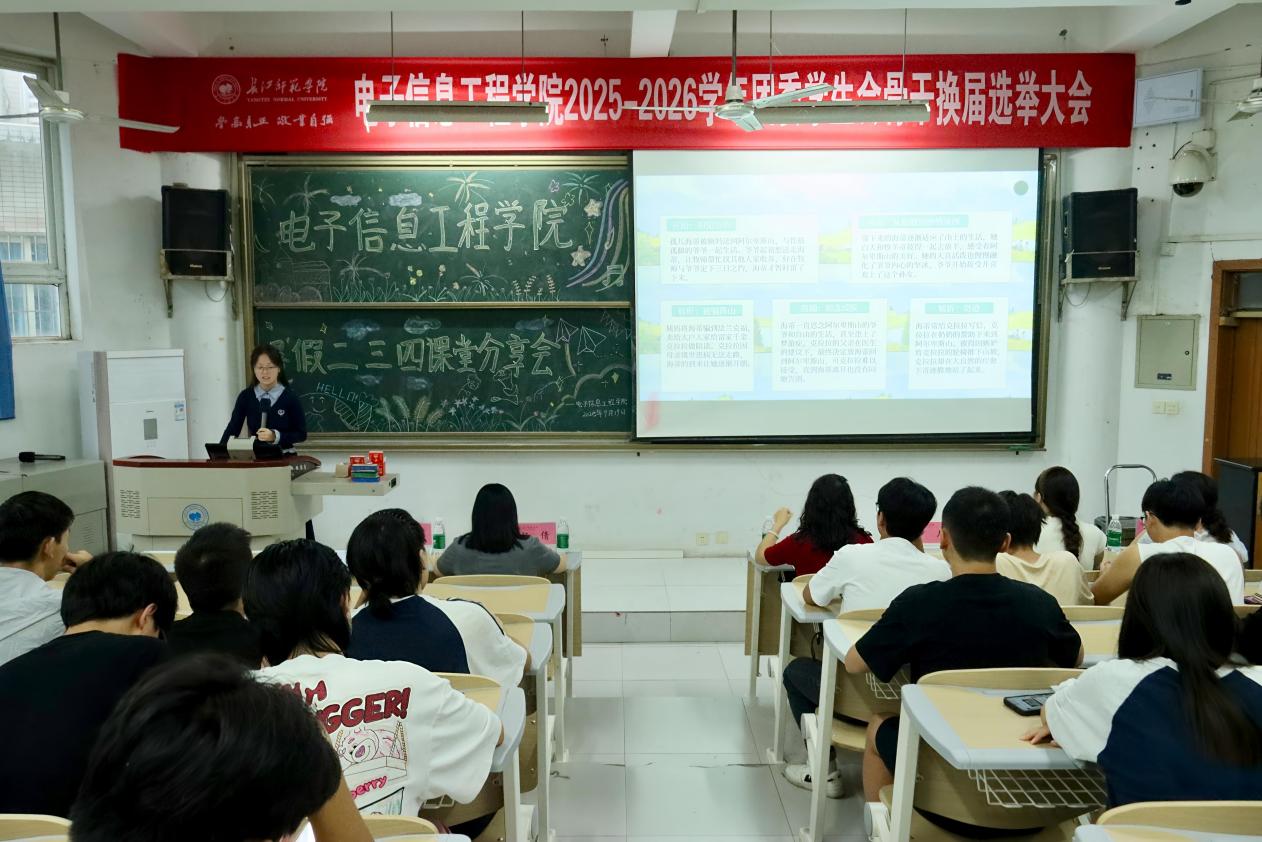 于9月19日14:00在格03阶梯教室举办电信学院暑假二三四课堂分享会。团委书记罗月,22级辅导员邓志平,23级辅导员陈玲和李阳莉,24级辅导员杨倩担任本次分享会的评委。