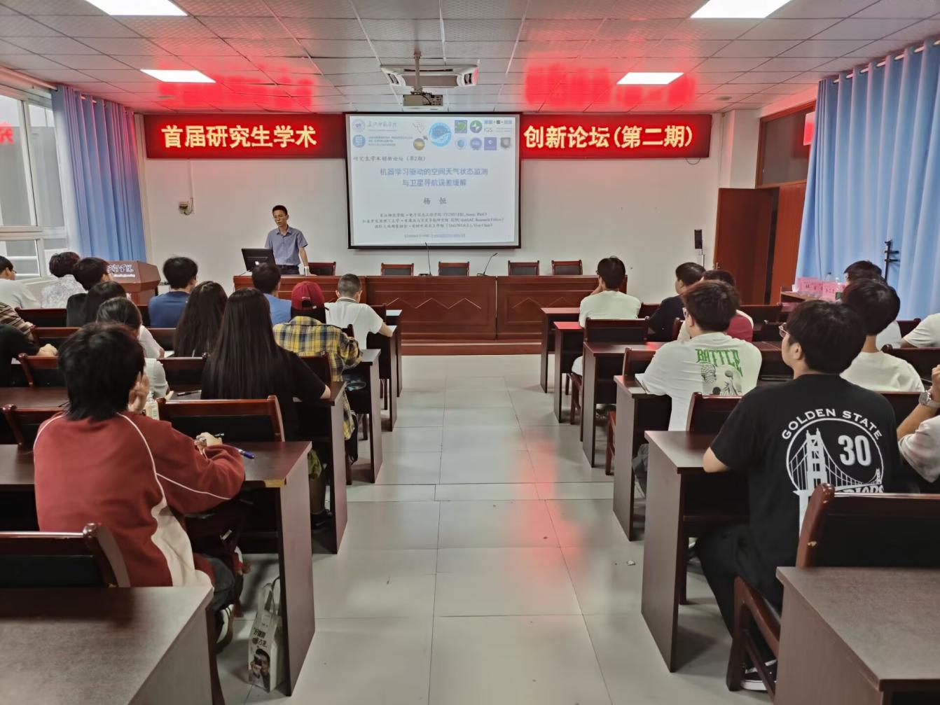 首届研究生学术创新论坛(第二期)于9月23日下午在格物楼1508举行。杨恒副教授作题为“机器学习驱动的空间天气状态监测与卫星导航误差缓解”的学术报告。报告由学院副院长谭勇主持,电信学院2025级全体研究生新生参会。