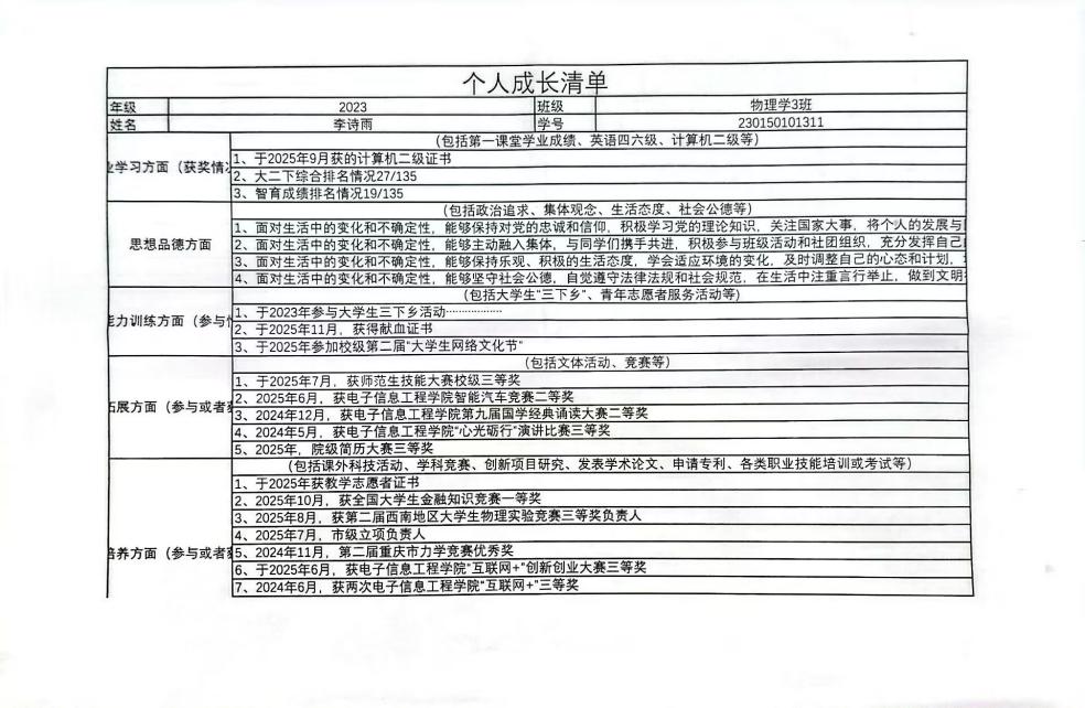 绘成长轨迹,鉴优秀榜样——电信学院举办“个人成长清单”主题活动2025年11月28日至12月2日,a片无码 团委学生会携手学风建设部,面向23级、24级及25级全体学生,共同举办“个人成长清单”主题活动。该活动以“梳理成长轨迹、明确发展方向”为核心宗旨,旨在吸引全院学生积极参与。 在活动筹备阶段,主办方通过班群定向通知、学院新媒体平台推广等形式扩大覆盖;在实施过程中,学生围绕学业、实践和思想等多个维度,提交包含成果证明和成长简述的完整材料包,全面展示个人发展状况。在评选环节,工作人员严格按照“真实、完整、规范”的标准进行评审,最终确定了一项一等奖、两项二等奖、三项三等奖及四项优秀奖,并部分同步公示了评选结果。